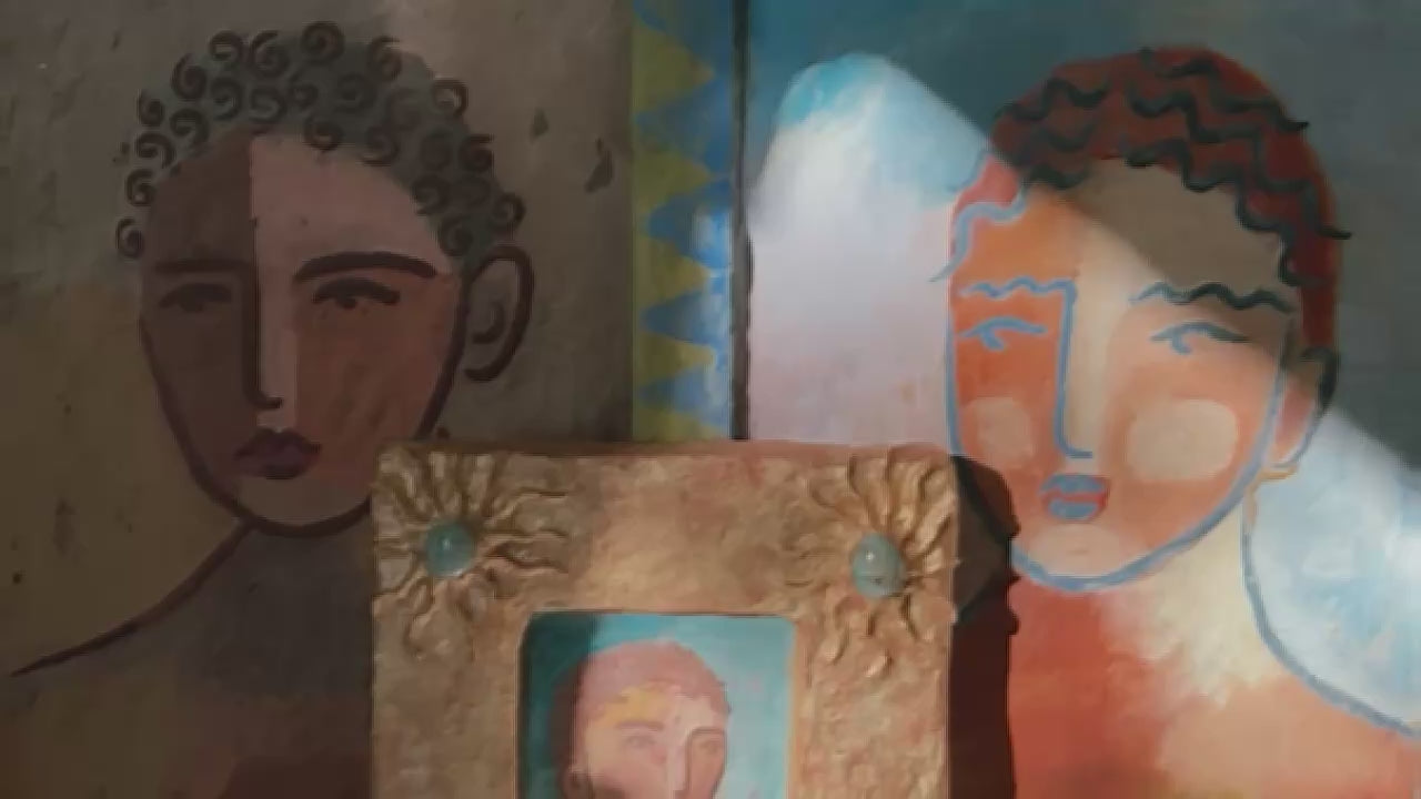 Sculptural, textured fresco-inspired portraits crafted from recycled cardboard & paper.